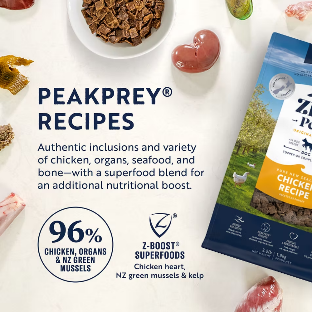 Ziwi Peak風乾狗糧放養雞配方是由新西蘭本地放養雞、內臟及新西蘭綠唇貽貝製造的。