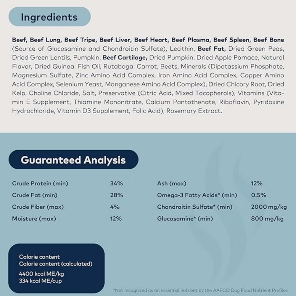 羊肉,羊肺,羊肚,羊肝,羊心,羊血漿,羊骨 ,羊脾臟,綠色豌豆乾,綠色扁豆乾,羊脂肪,卵磷脂,羊軟骨,藜麥乾,乾蘋果蓉,天然香料,魚油,菠菜,羽衣甘藍,綠色豆子,甜菜葉,礦物質,乾菊苣根,海帶乾,膽鹼氯化物,鹽,天然防腐 (檸檬酸,混合生育酚),維他命,迷迭香萃取物。